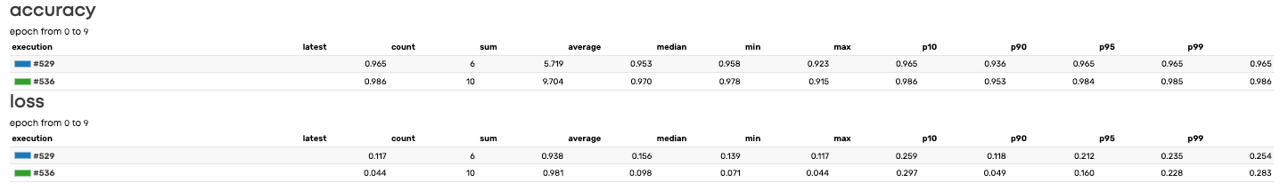 Select multiple executions and compare their metrics side-by-side. Sort by accuracy, filter by loss, find your best model in seconds.